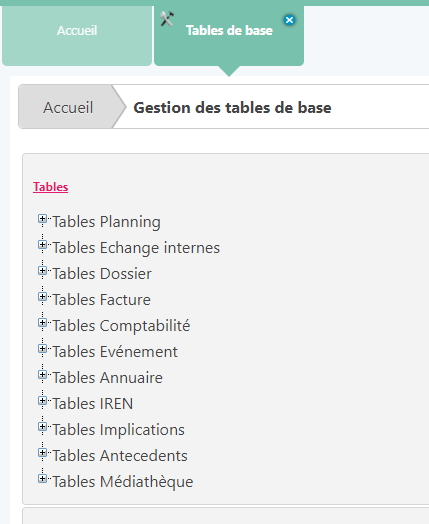 Les tables de base sont directement accessibles de la Page d'accueil iREN