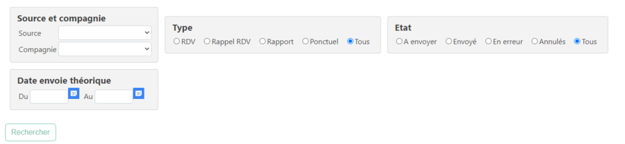 Cette page permet de consulter les envois de SMS ainsi que l'état de l'envoi (en attente, énvoyé).